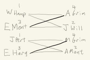 "This is the state of affairs during the first figure of your gallivant, yes? Wallace Hampton is partnered with Miss Grimsby, Edward Montjoy with Miss Willoughby, Lieutenant Pertwee with Miss Matilda Grimsby, and Edward Hargreaves with yourself."